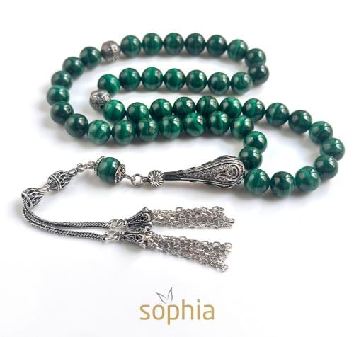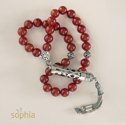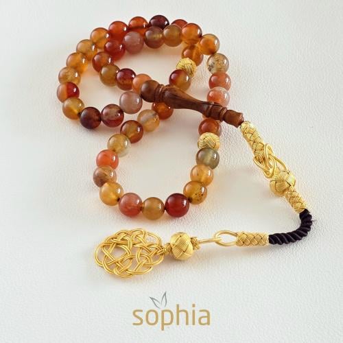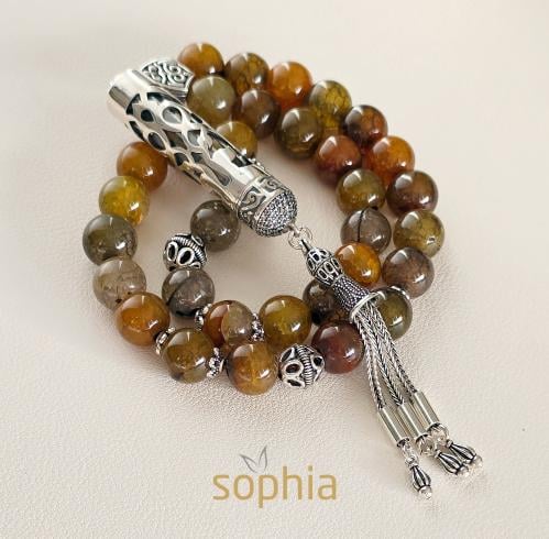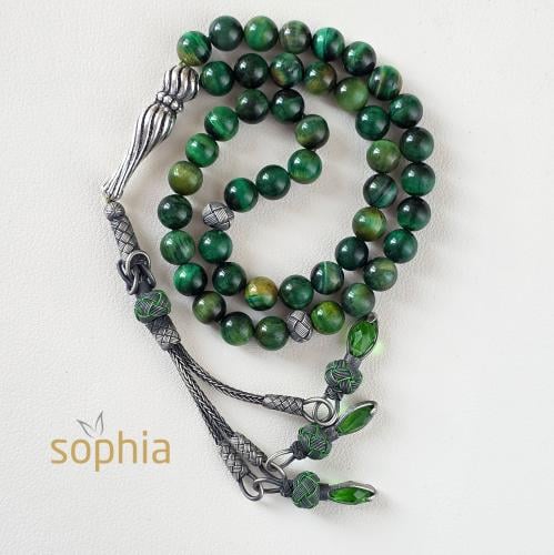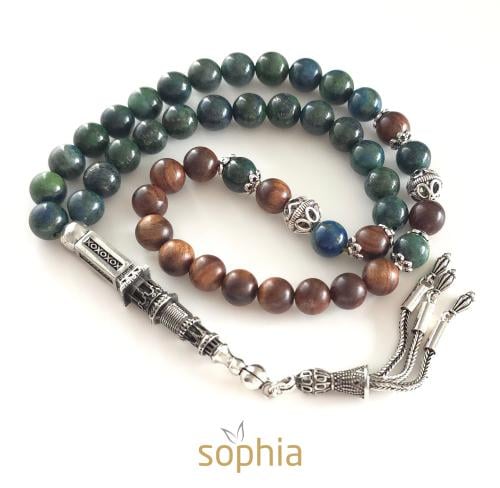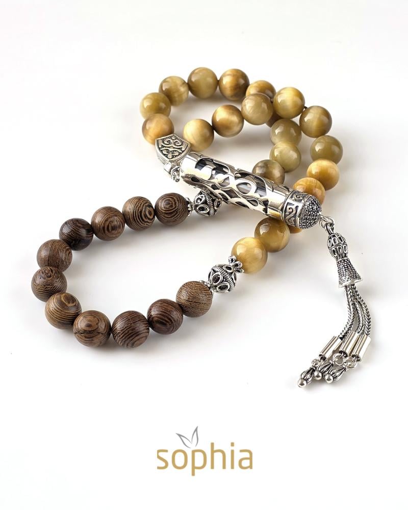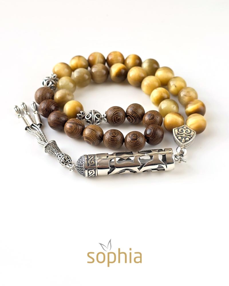 سبحة تم تصميمها من حجر عين النمر وخشب الصندل