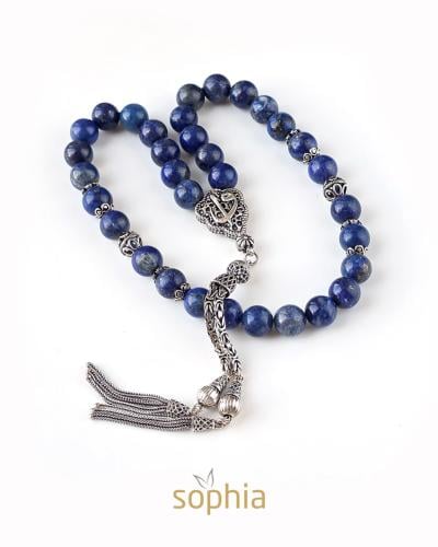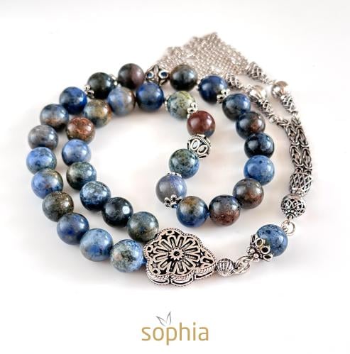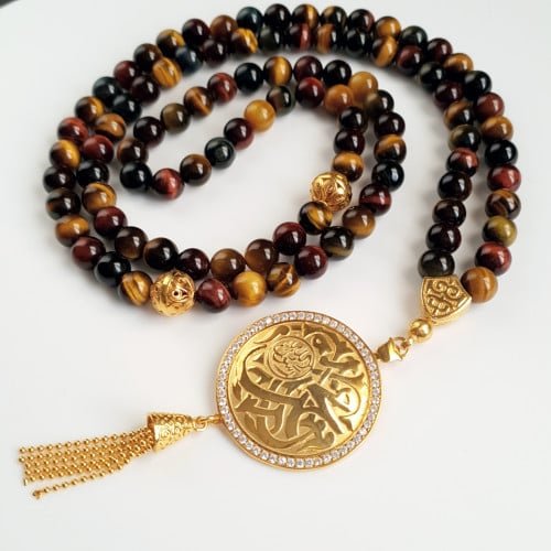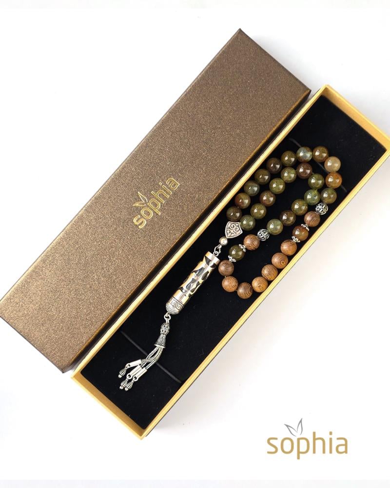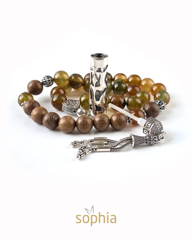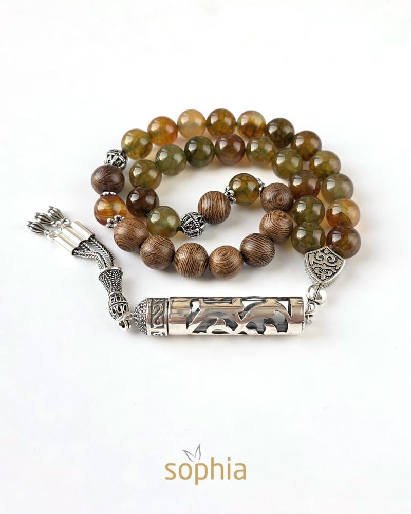سبحة تم تصميمها من حجر العقيق (عروق التنين) مع اضافة حبات من خشب الصندل