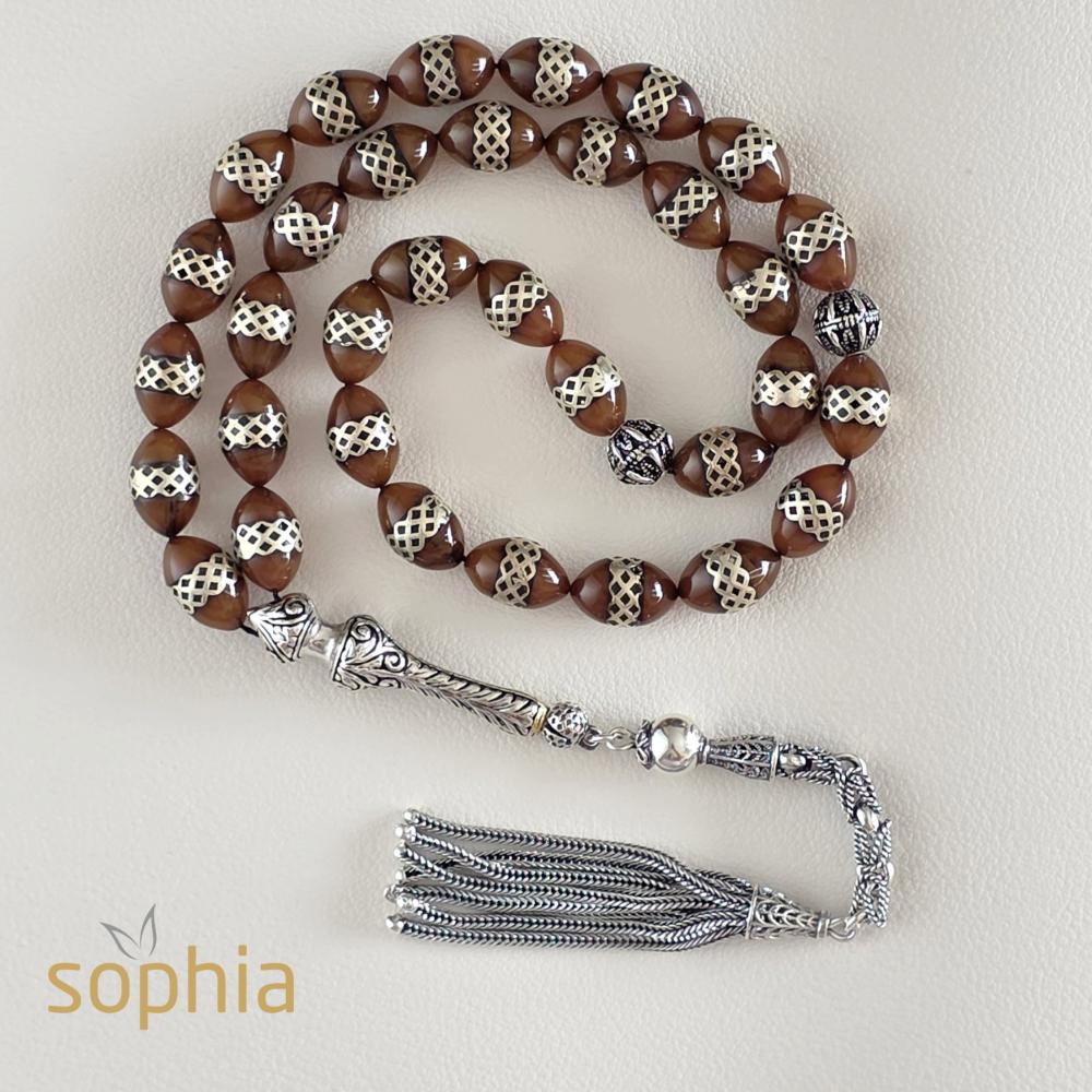 An elegant Fatouran rosary with brown oval beads, decorated with 925 silver inlays in a luxurious mesh design, reflecting the beauty of craftsmanship and precision of detail.