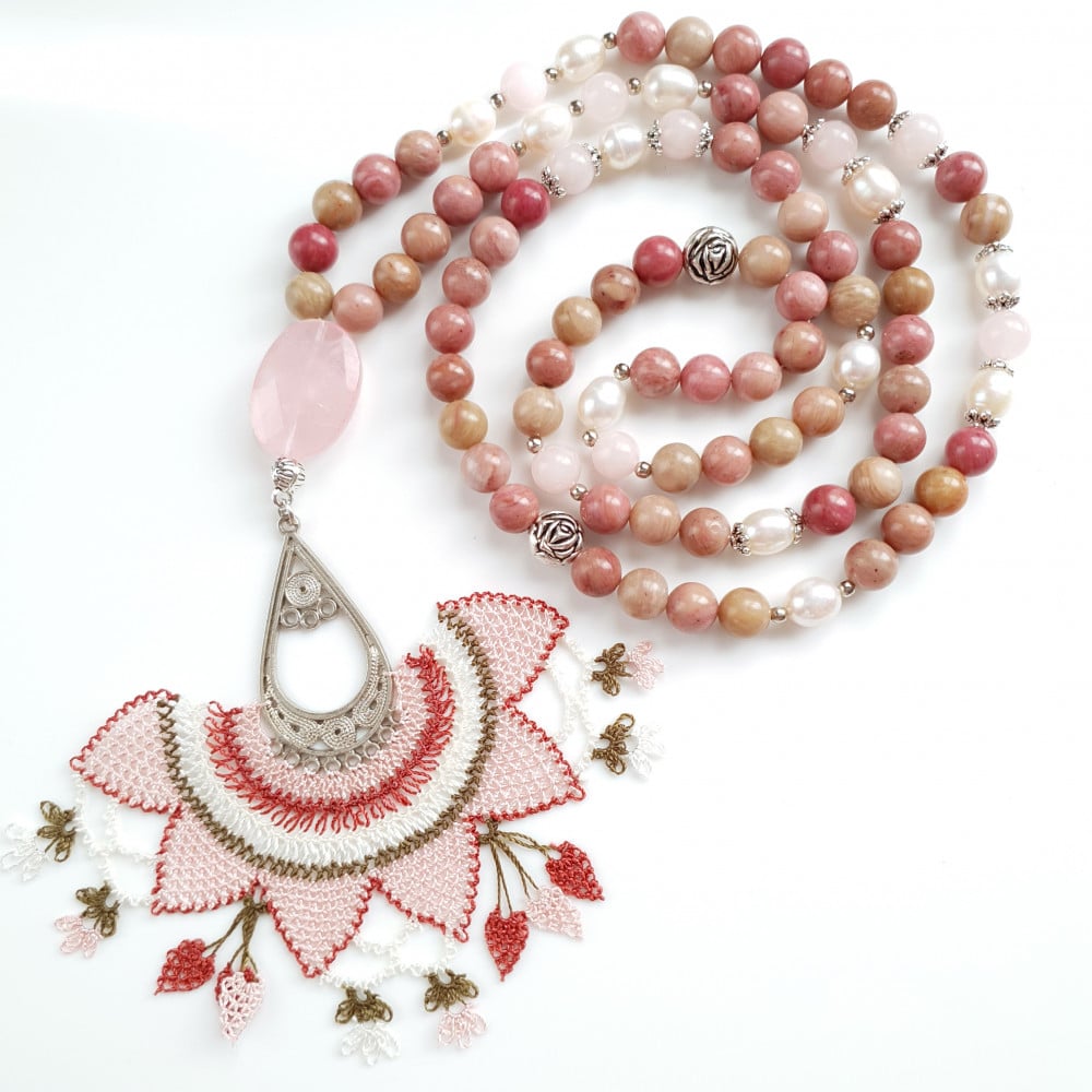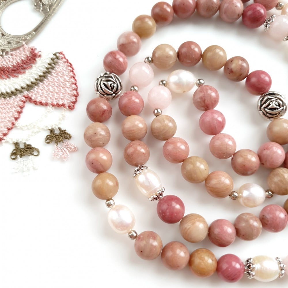 Rosary designed from Rhodonite stone with the addition of beads of pink quartz stone and natural pearls