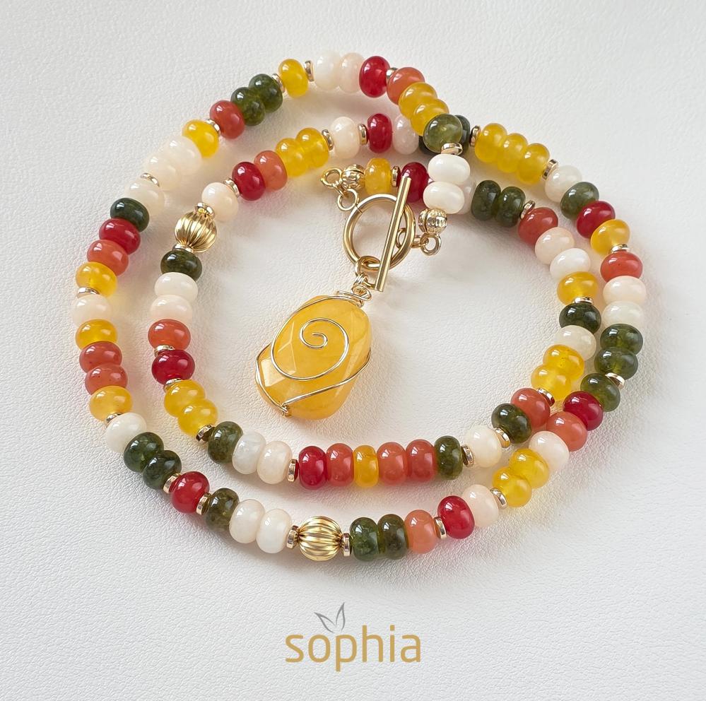 A rosary designed from a selection of natural stones such as: aquamarine, jade, tourmaline, and chalcedony.