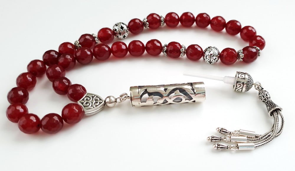 The minaret is made of a glass bottle decorated with Islamic art motifs.. An elaborate handmade design of 925 silver