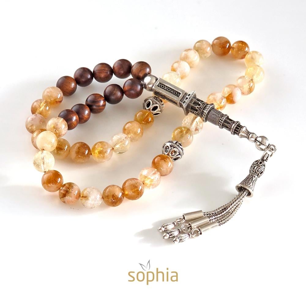 A harmonious blend of the warmth of wood and the luster of transparent, golden stones.