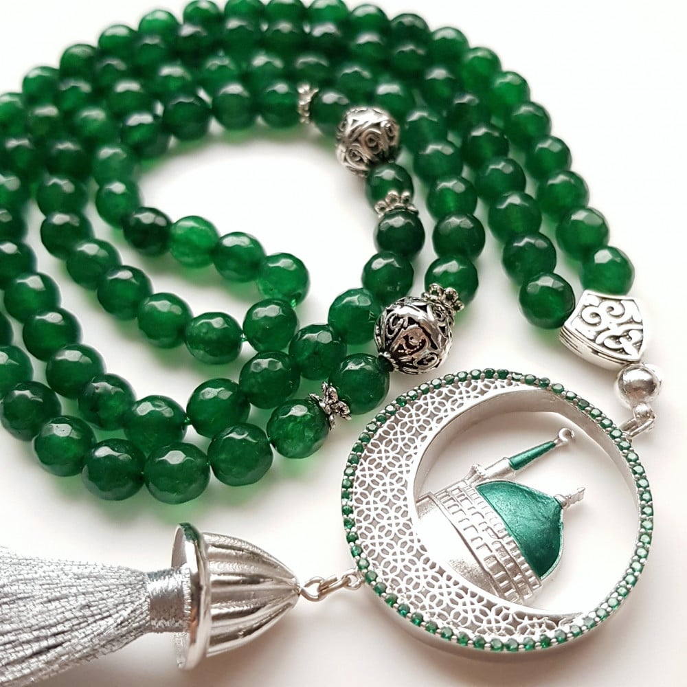 The minaret is a circular piece inlaid with zircon stones..inspired by the green dome of the Prophet’s Mosque and decorated with a crescent symbolizing the crescent of the blessed month of Ramadan..a silver tassel was added at the end of the minaret