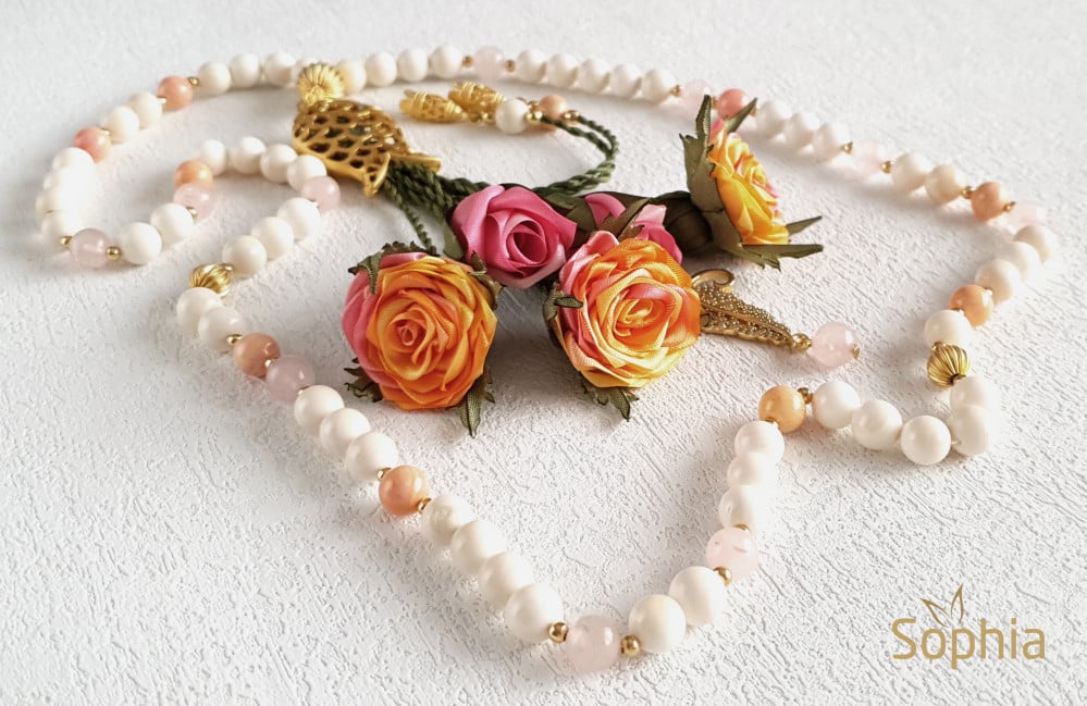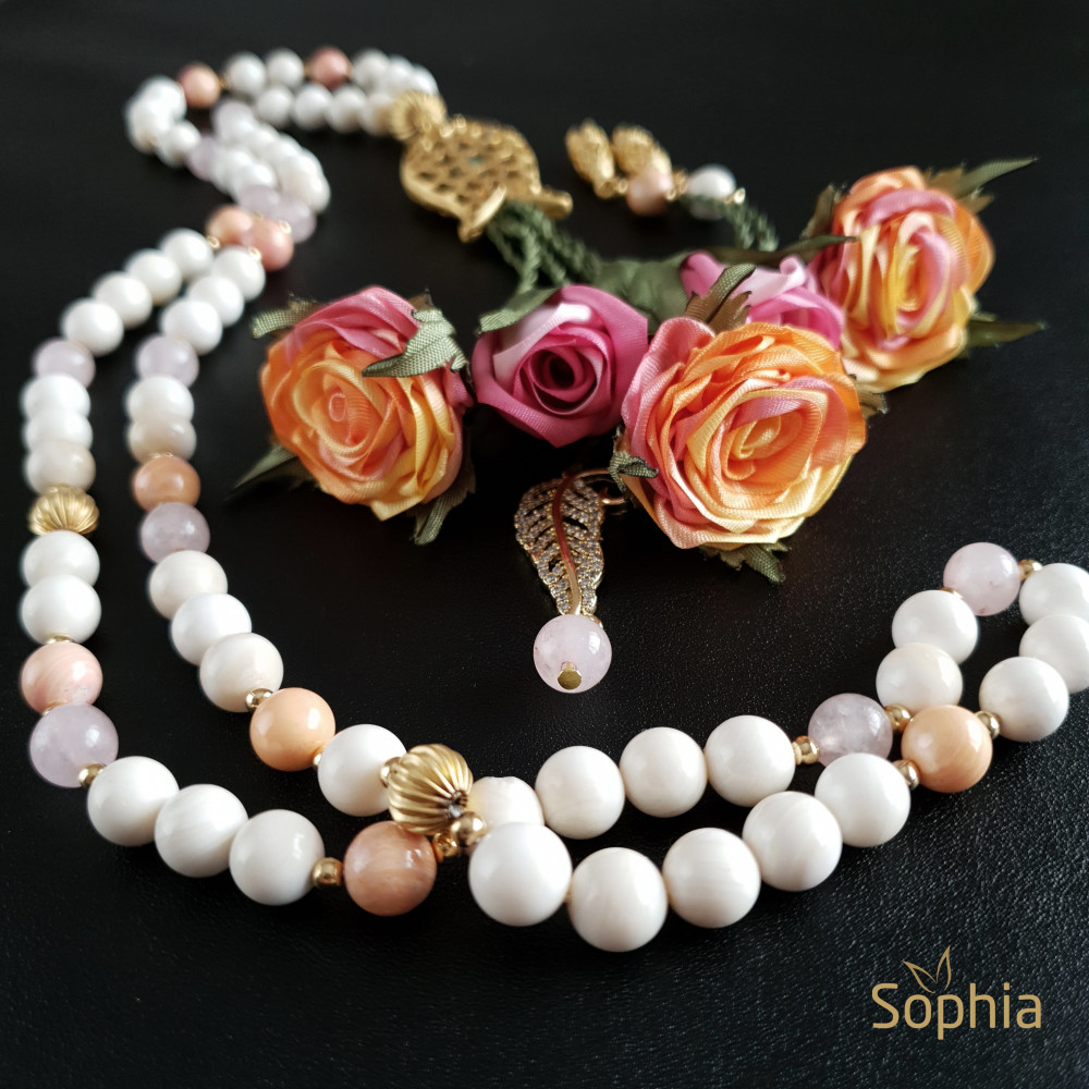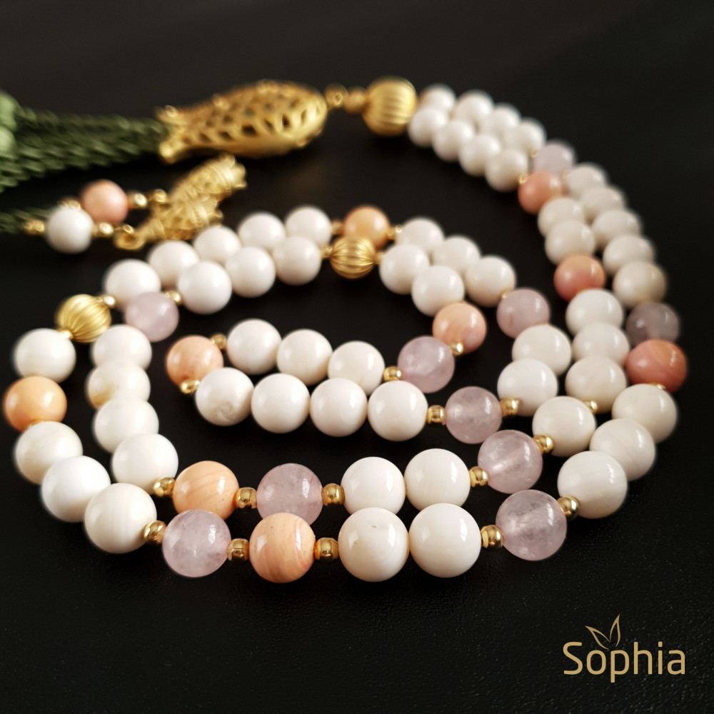 Rosary designed from mother-of-pearl stone with the addition of beads of pink quartz