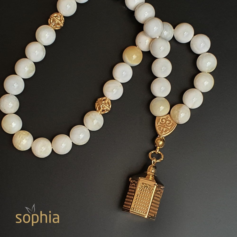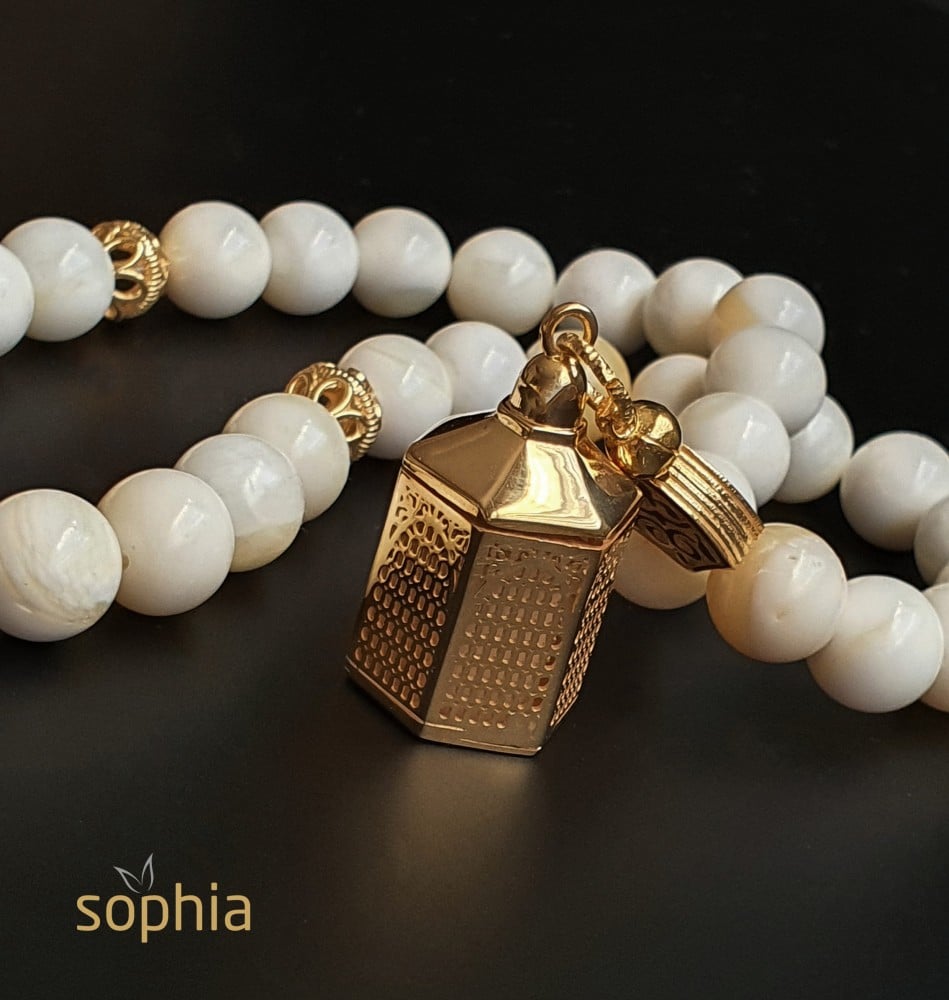 A rosary designed from minaret shell stone, inspired by the beauty and magnificence of the building of the shrine of Abraham, peace be upon him